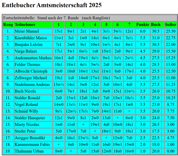 Nach vier Jahren erkämpfte sich der Favorit Manuel Meier endlich wieder mal den Amtsmeistertitel. Die Überraschung des Turniers war der Nachwuchsspieler Marco Kneubühler, der mit starken Partien Silber holte. Im dritten Rang klassierte sich der Titelverteidiger Lulzim Bunjaku. Erfreulich ist auch das Resultat von Christoph Albrecht, welcher direkt hinter den Spitzenspielern einen sehr guten Rang erreichte.